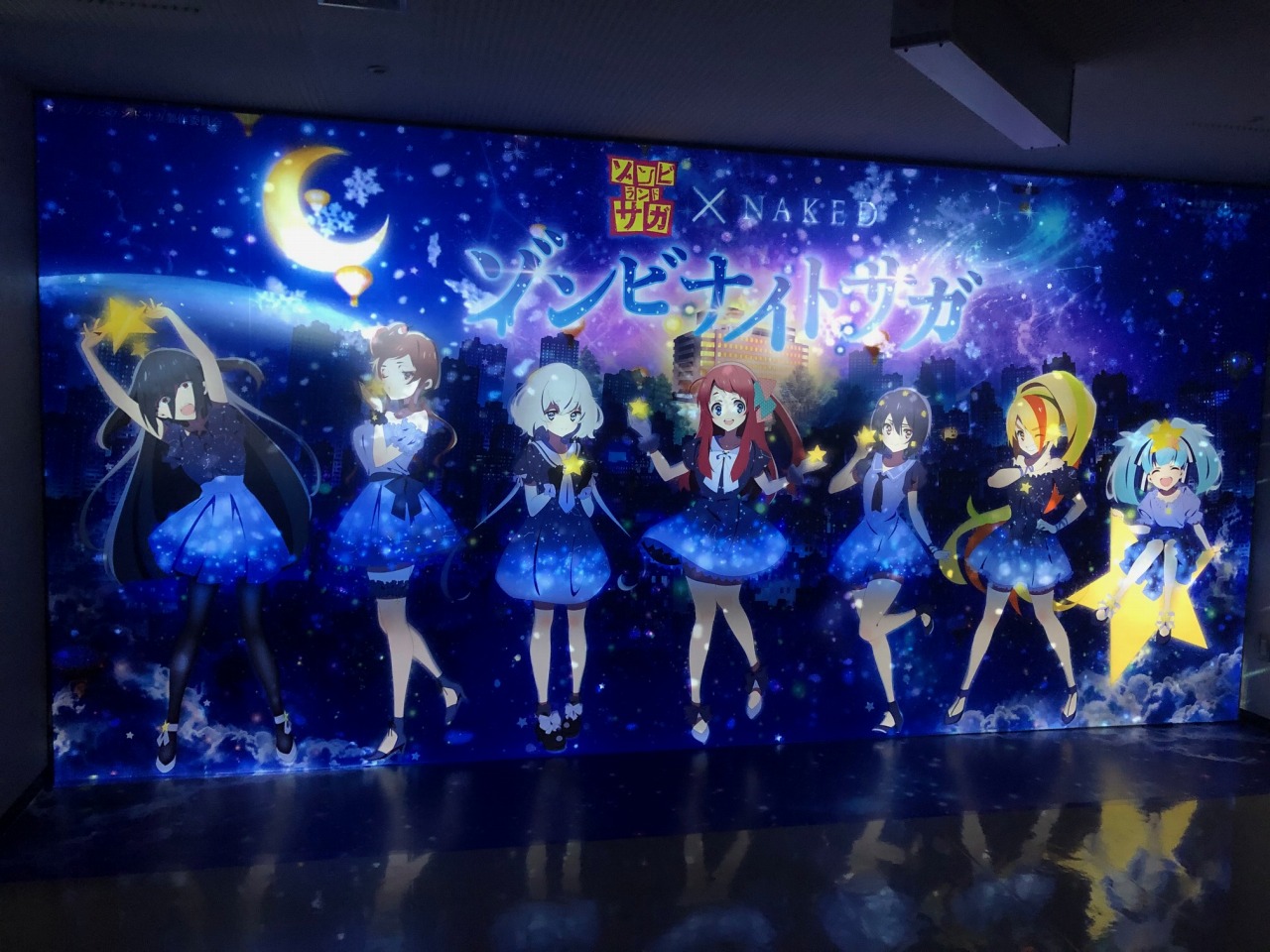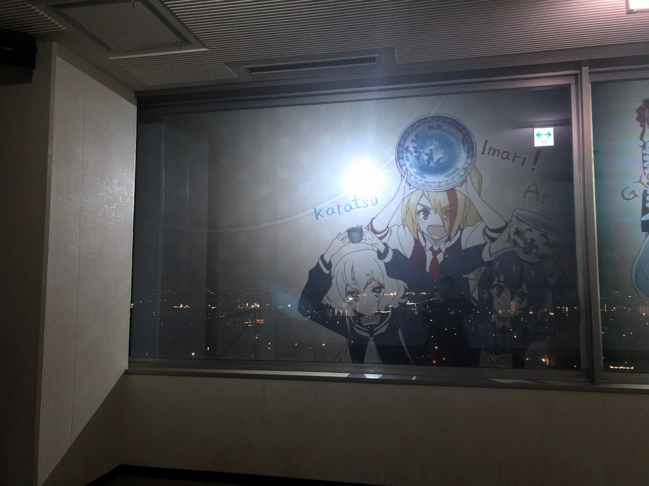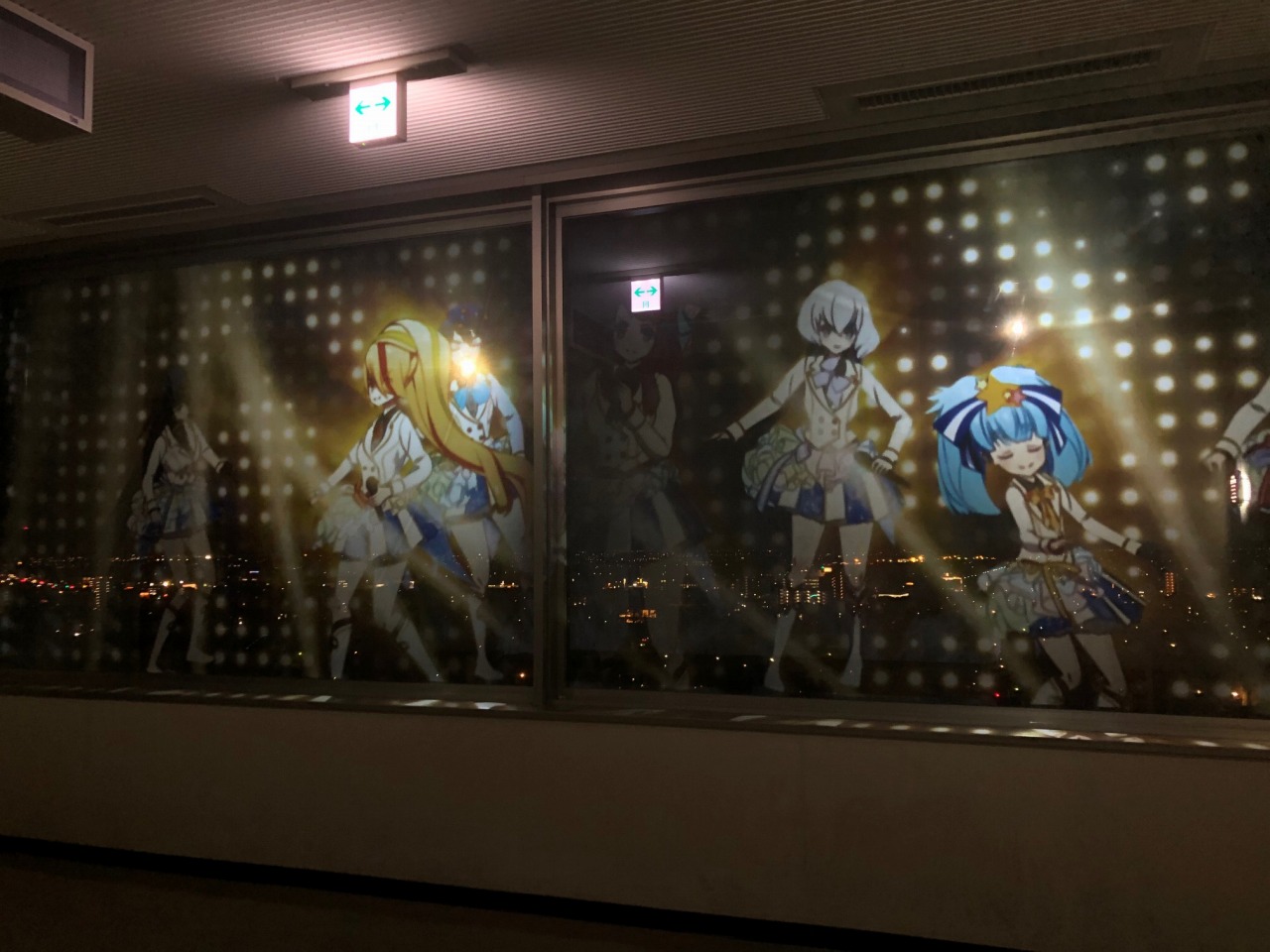 夜景の映るガラスに映像を投影。別にアニメ映さなくても面白いものができそう。